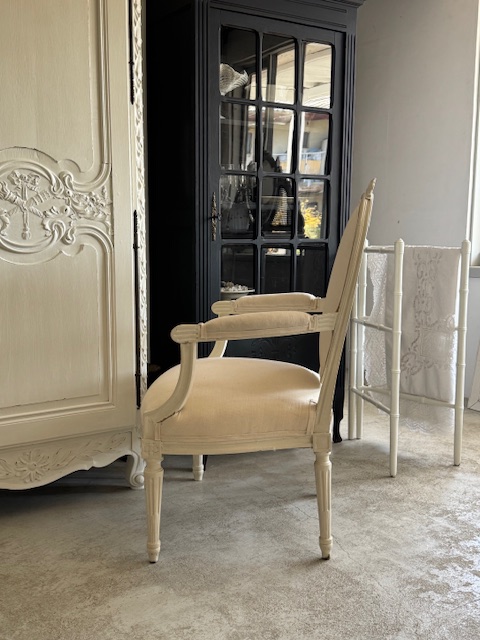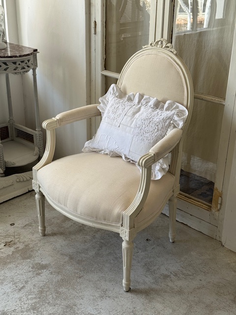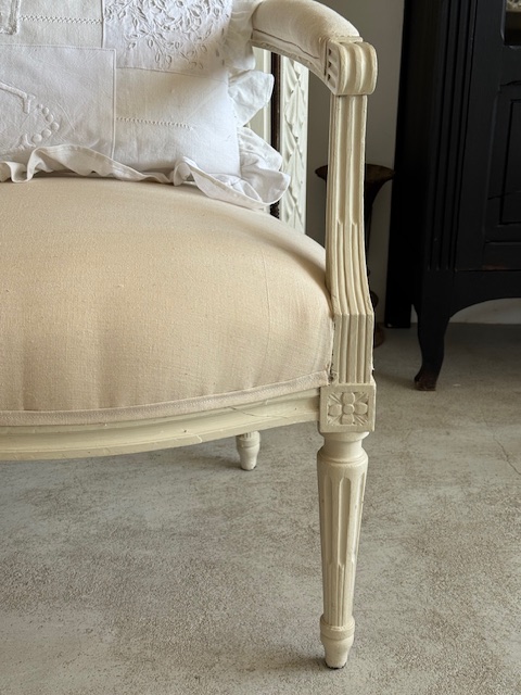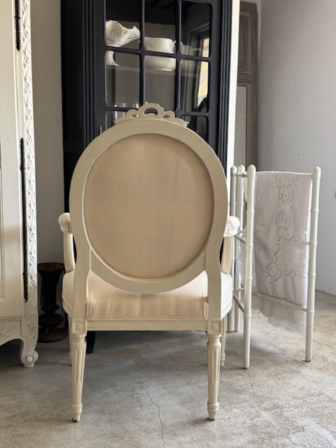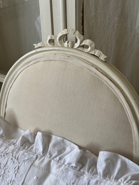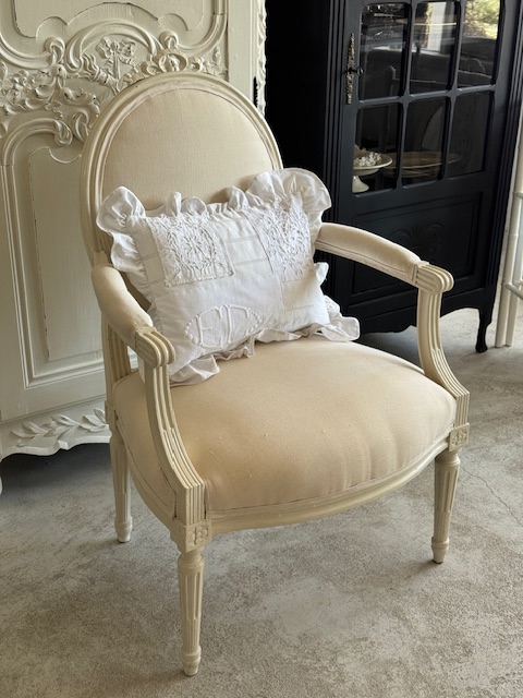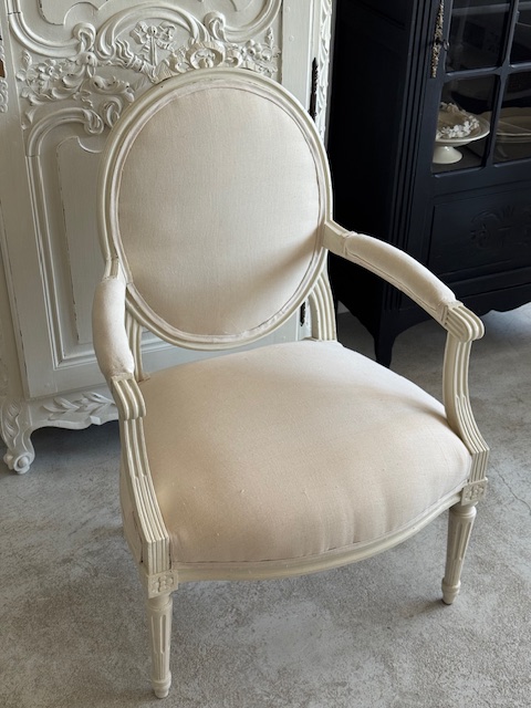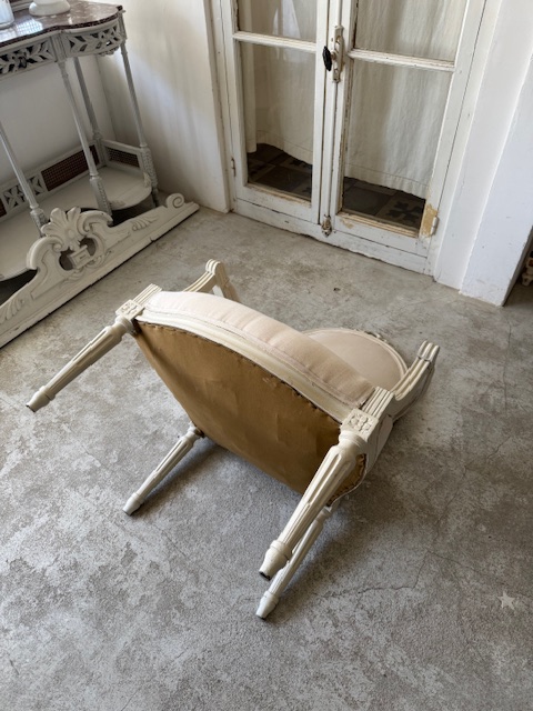 背もたれ、アーム部分、座面の張地は1900年初頭のフランスアンティークリネンにて張り替え済み。