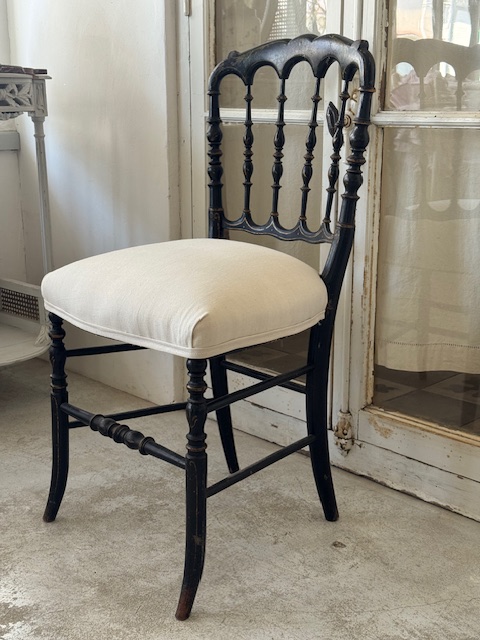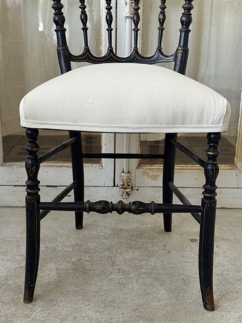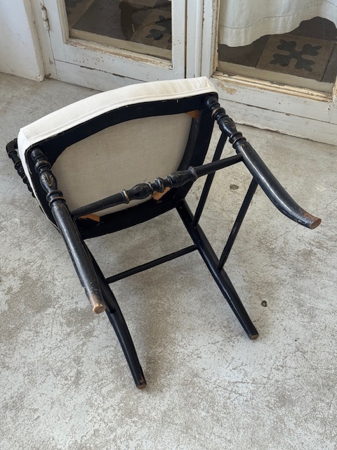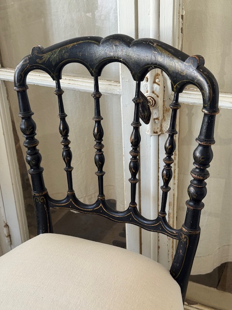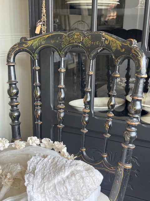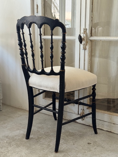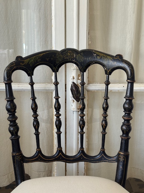 当時のオリジナルの塗装が美しく残されており背もたれには手描きの繊細な花模様、脚部にも同様に装飾が施された大変趣のある一脚です。