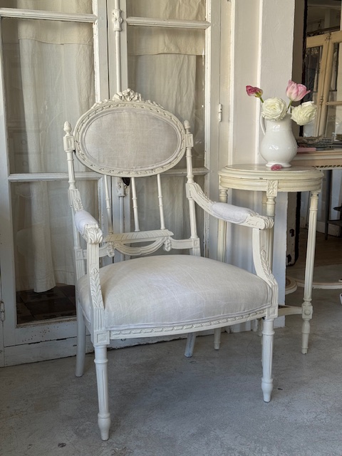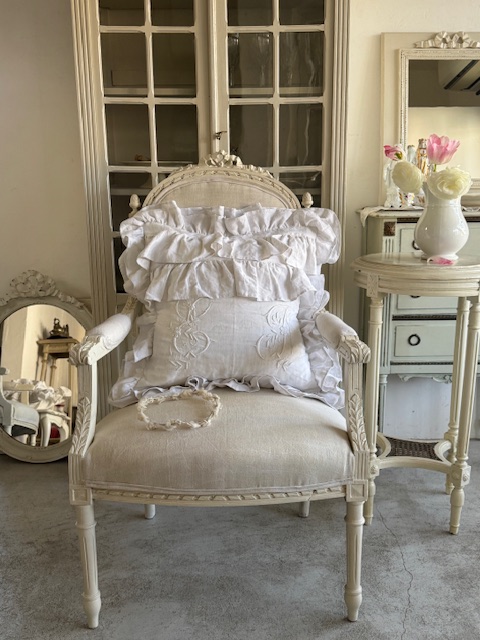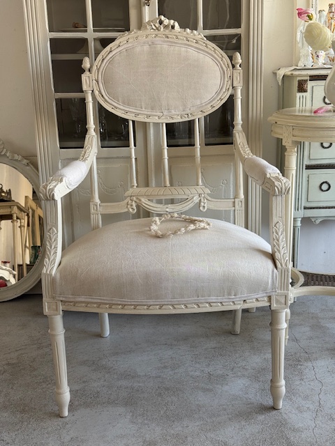 ヘッドトップのリボンモチーフ背面の繊細な彫刻装飾アームの優美なラインと細やかな彫りなどどの角度から見てもエレガントでまるでフランスのサロンに佇むかのような気品を感じさせるお品です。
