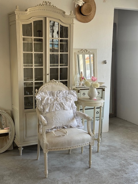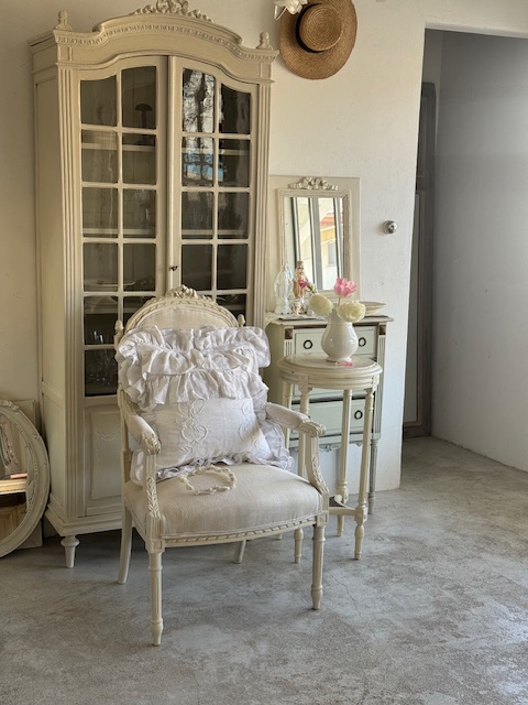 リボン装飾のキャビネットやミラーフレンチシックな家具との相性も抜群です。