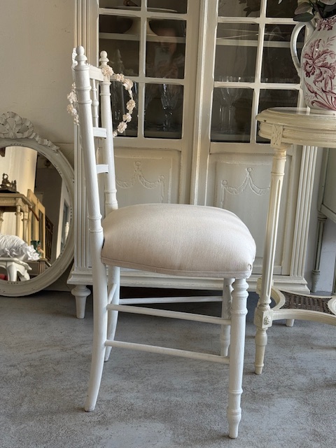背もたれの上部に施されたリボンモチーフ装飾が特徴的なお品です。
