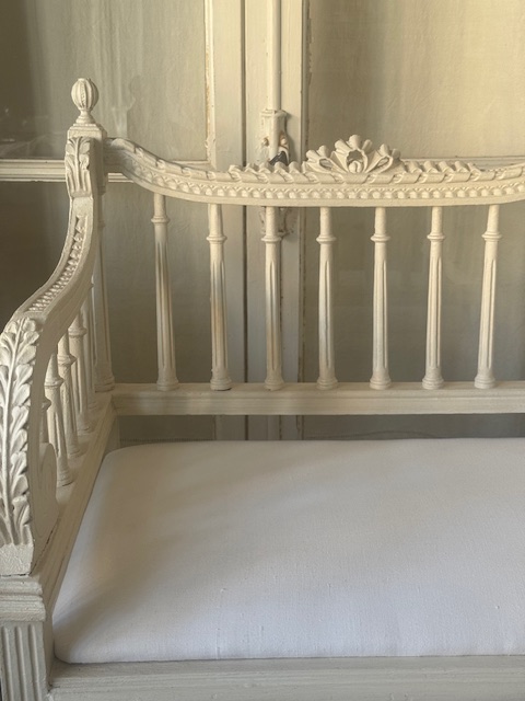 背もたれの中央にはリボンモチーフが施され、両サイドには美しい手彫りの装飾、さらに側面には繊細な葉模様が彫り込まれています。