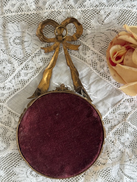 裏側には当時のまま残されたワインレッド色のベルベットが確認でき長い年月を経てきたアンティークならではの趣を感じていただけます。