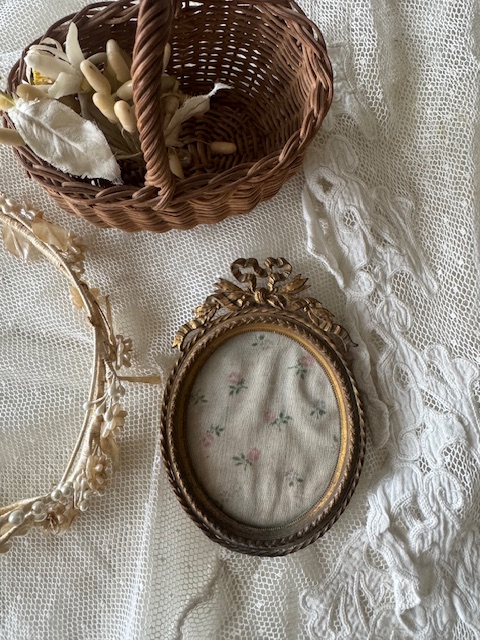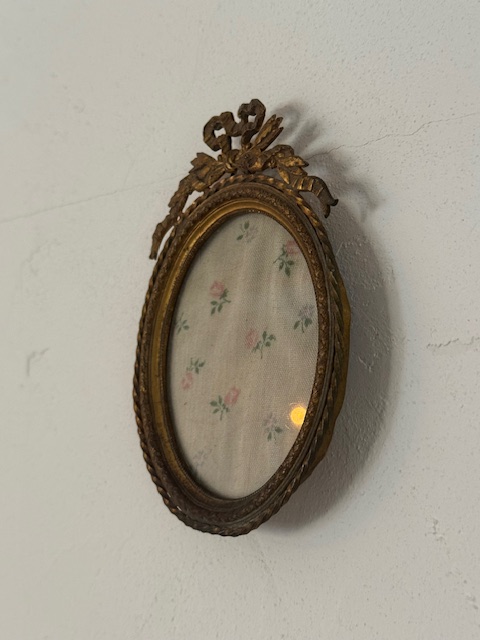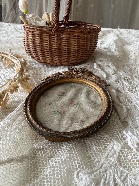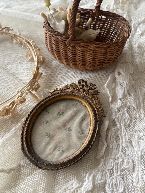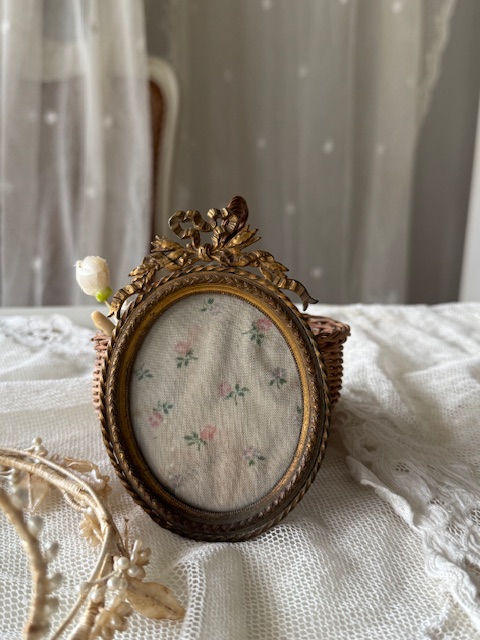 リボンモチーフが美しいゴールドカラーのアンティークフォトフレーム。