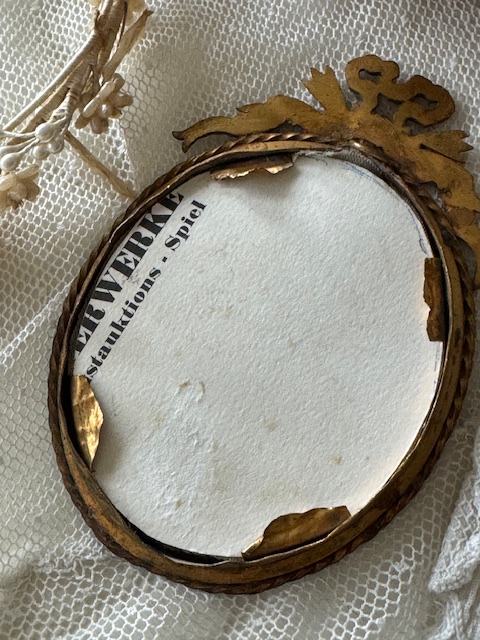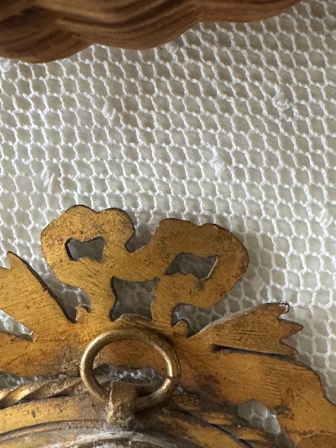 トップにあしらわれた立体的なリボン装飾とねじり装飾の縁取りが当時らしい優雅で繊細な雰囲気を感じさせてくれます。