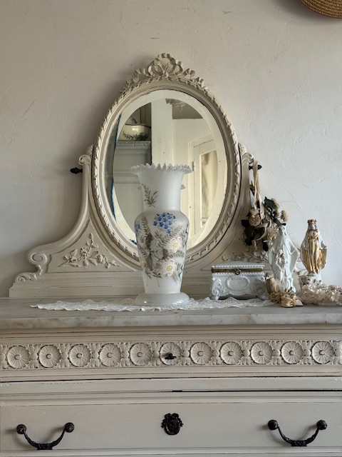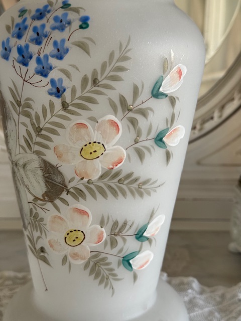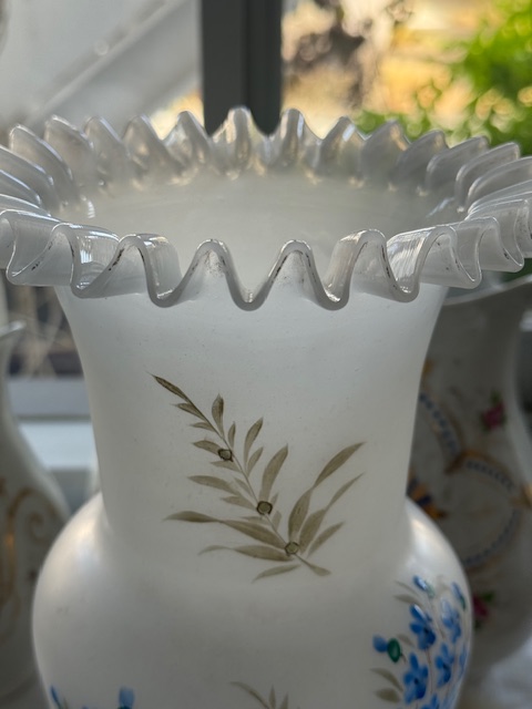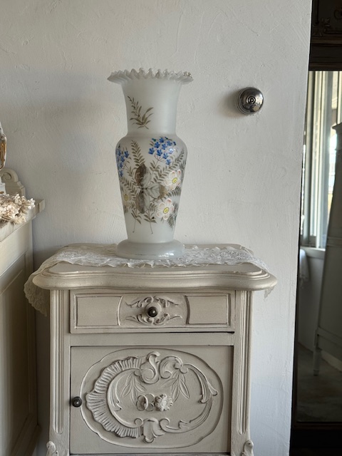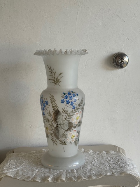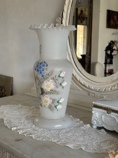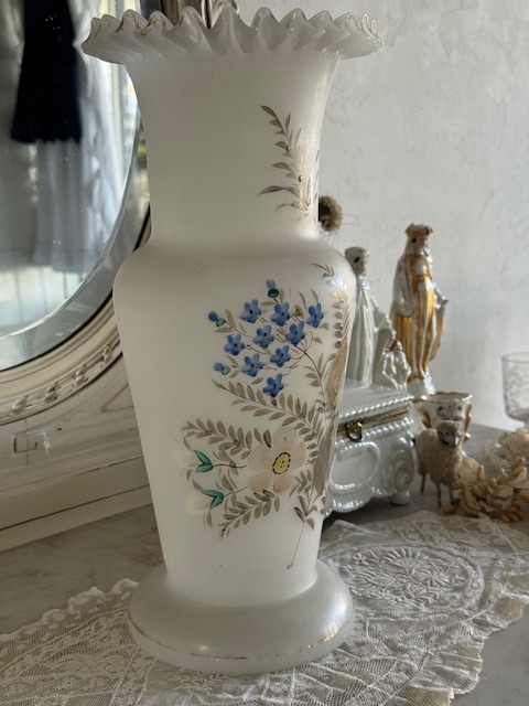 1800年代後半から1900年代初頭にかけて作られた、非常に美しく存在感のある大きめのフランスアンティーク・ホワイトオパリンガラスの花瓶です。