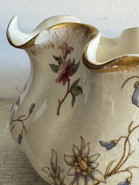 波打つようにうねるリム(口縁部)には上品な金彩が施され、器全体に手描きの花々が繊細に彩られています。