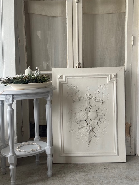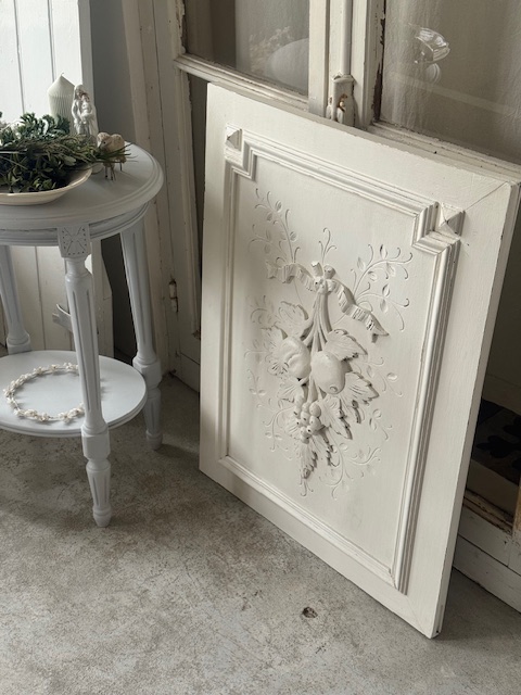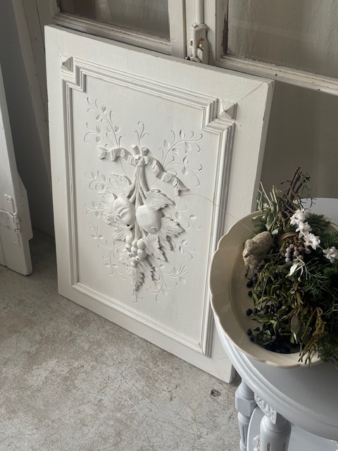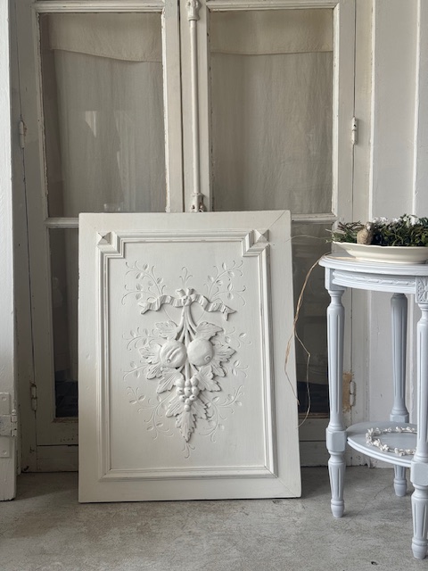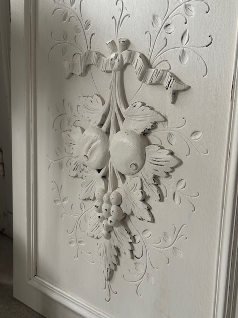 優しいエクリューホワイトのペイントが施され、果実や葡萄、リボンが結ばれたクラシカルなモチーフが立体的に彫り込まれています。