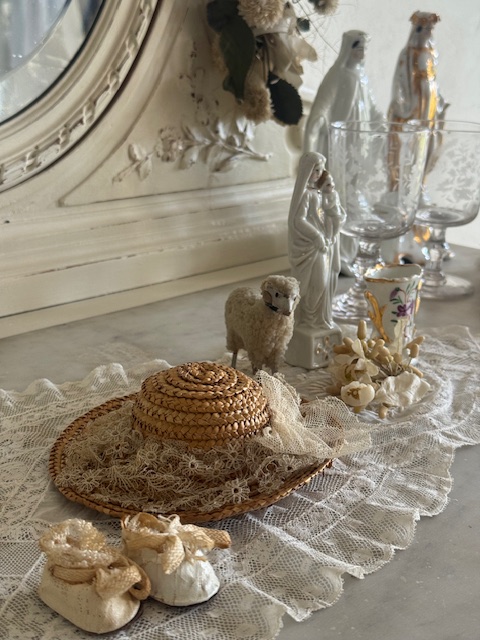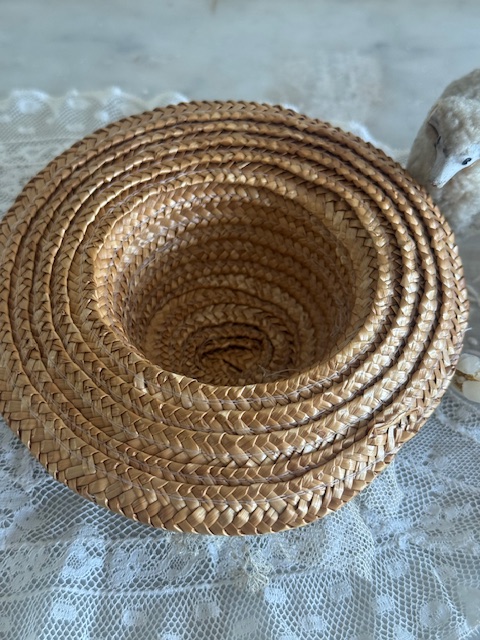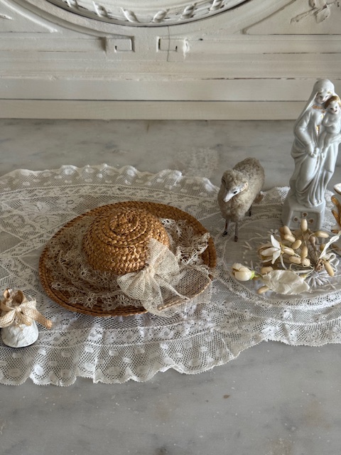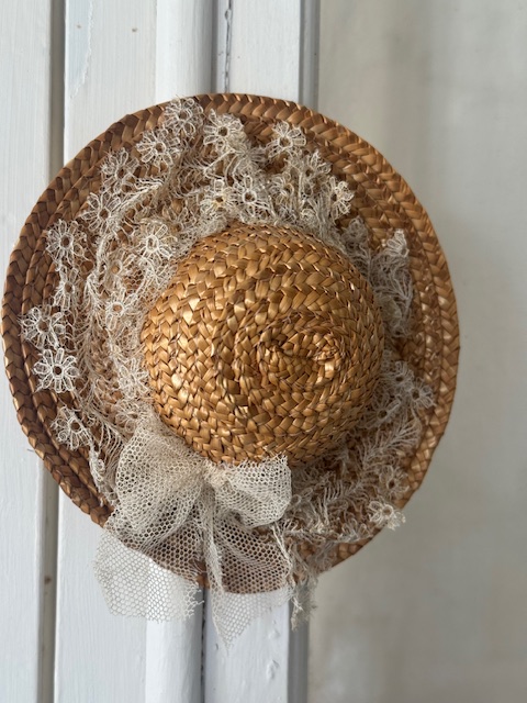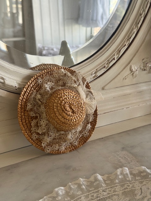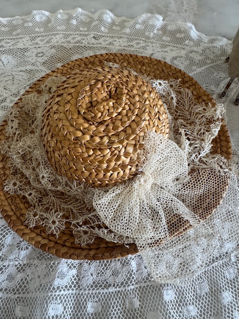 ナチュラルな麦わらに、柔らかいフランスアンティークのチュールレースと、繊細な花模様のレースがあしらわれた可憐なお品です。