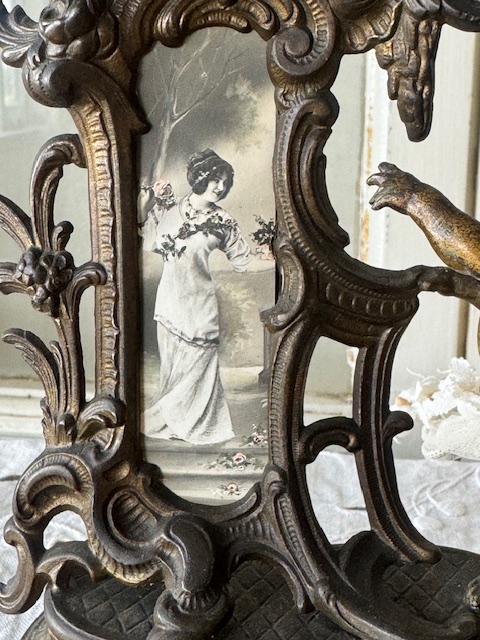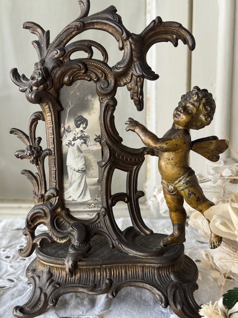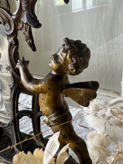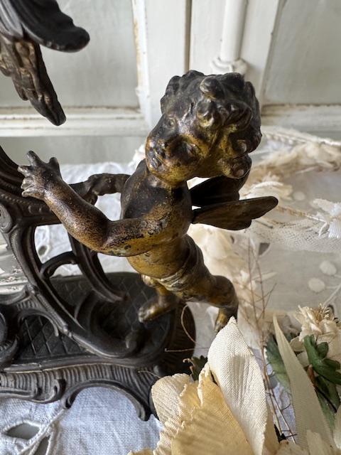 ブロンズ製の重厚感あるフレームに、優美な曲線の装飾が施され、天使が軽やかに舞う姿が立体的に表現されています。