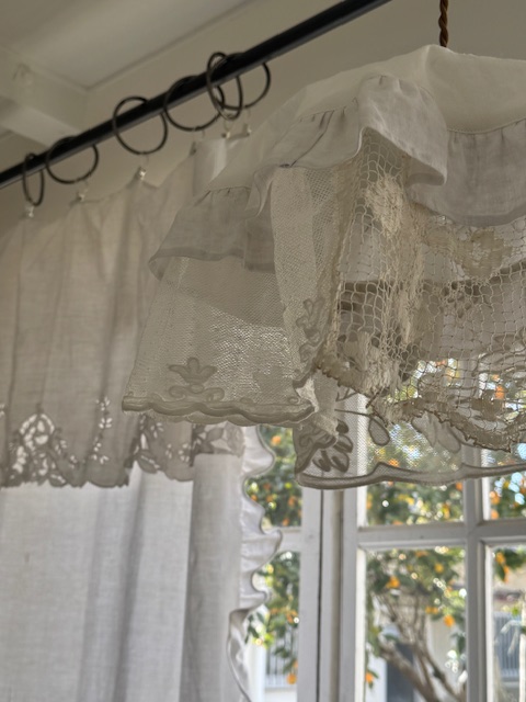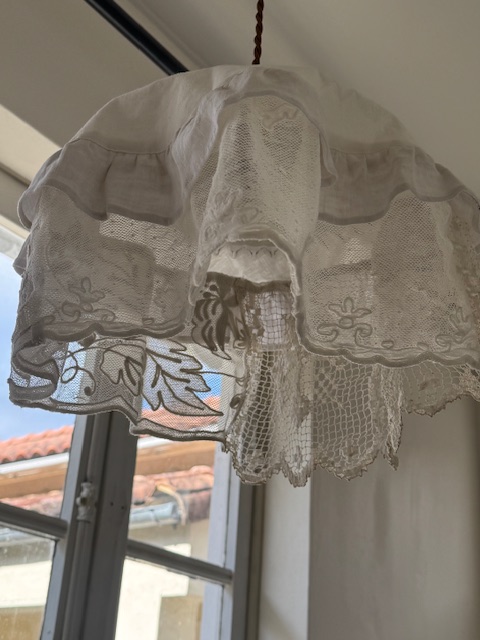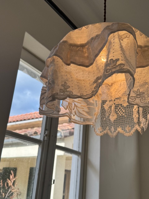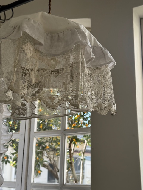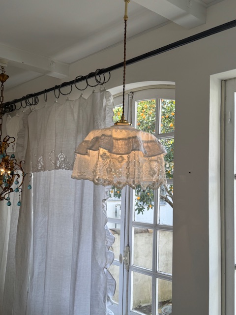 自然光が当たるとレースそのものの質感や立体感が際立ち電球を灯すと光を柔らかく包み込みながら空間全体をやさしくそしてとてもピュアな雰囲気に演出してくれます。