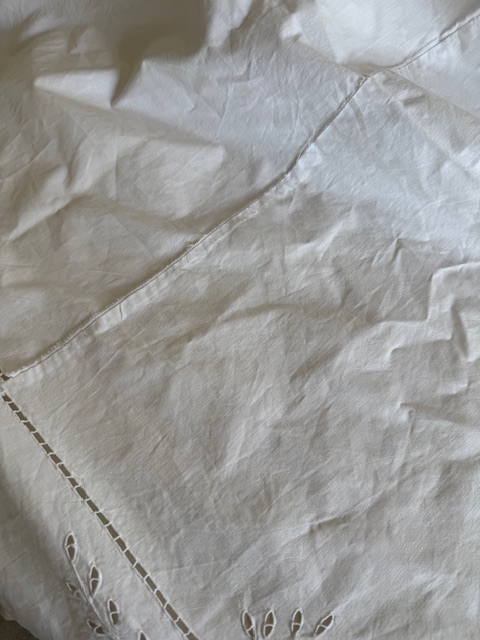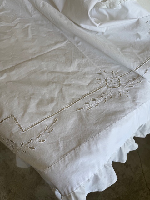 本体はしっかりとしたコットン生地、周囲を囲むフリル部分には1900年初頭のリネン素材が使用されております。
