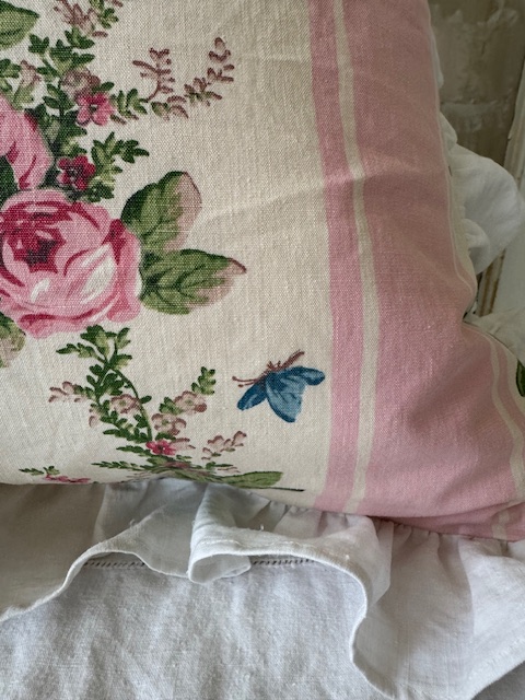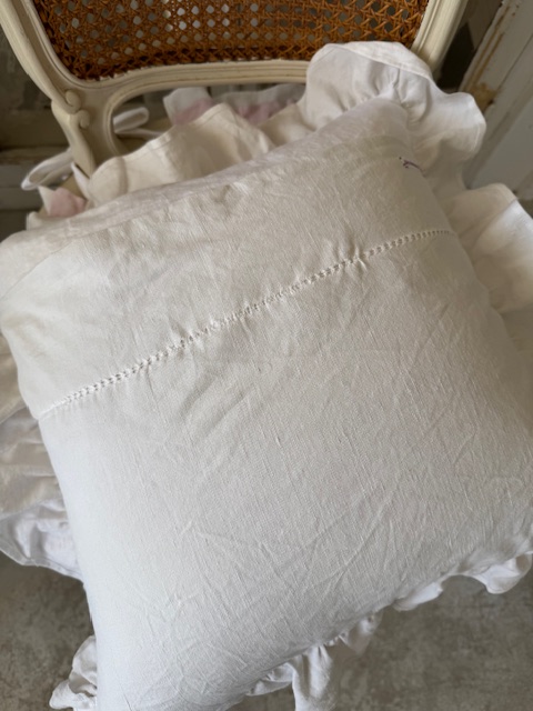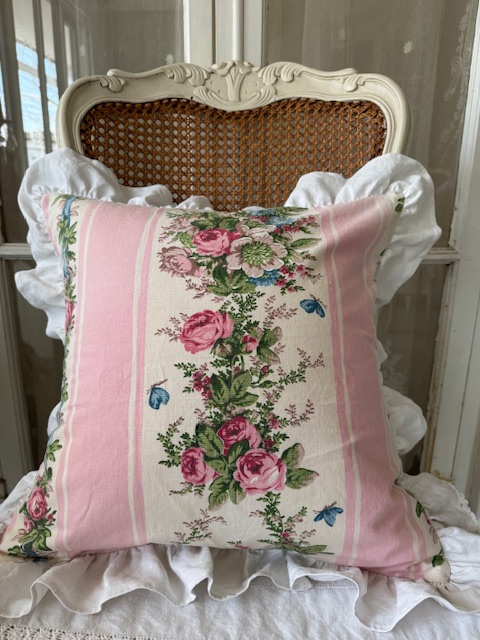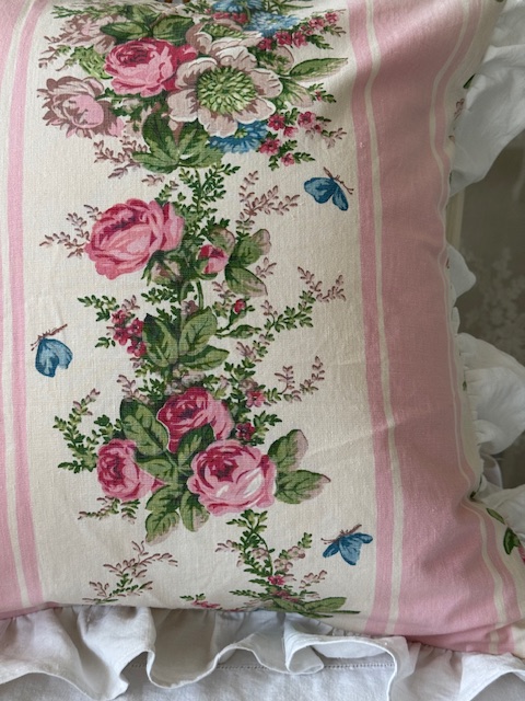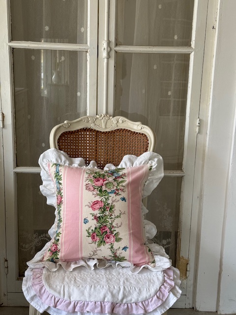 1900年初頭のフランスアンティークファブリックを贅沢に使用したフリル付きのクッションカバーです。