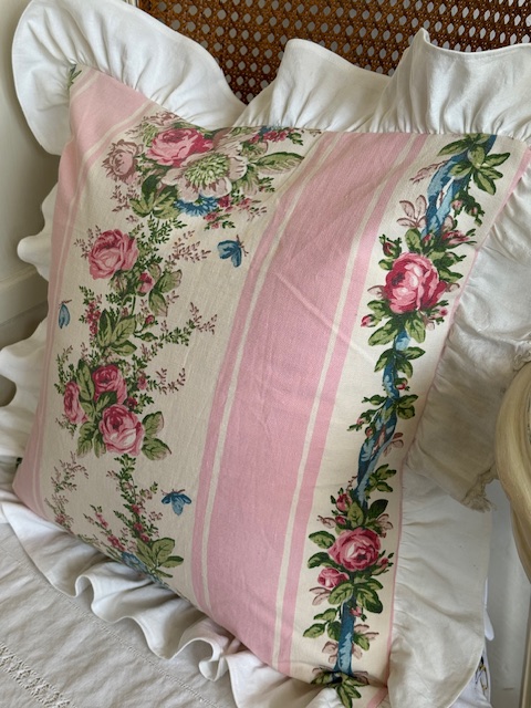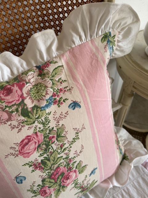 1900年初頭のフランスアンティークファブリックを贅沢に使用したフリル付きのクッションカバーです。
