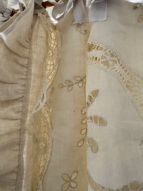 折り返し部分にはスカラップ状の花模様とレースを全面にあしらったフリル装飾が施されておりすべて当時の手仕事によるもの。