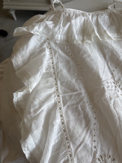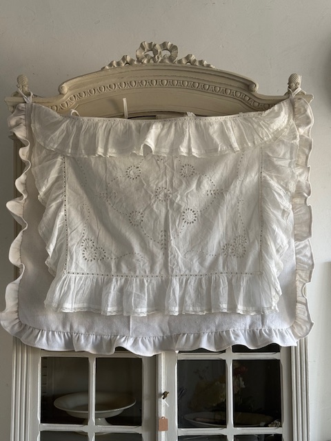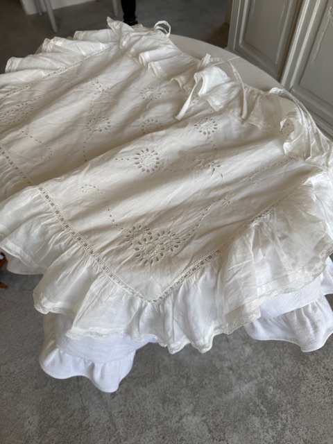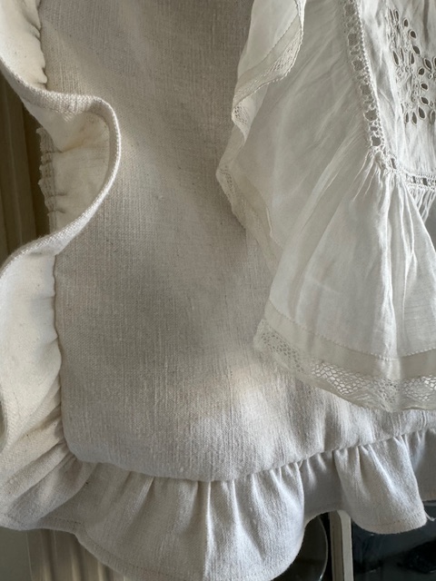 その厚手リネンの本体に、横・両サイド・裾にフリルが施され、さらにその上から非常に柔らかく繊細な薄手コットンのホワイトフリル装飾が重ねられています。