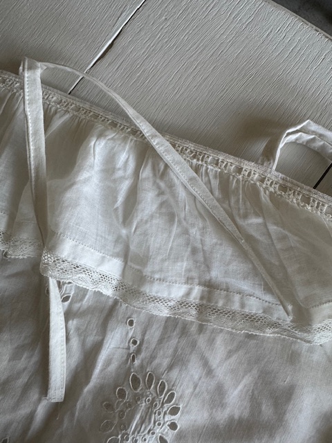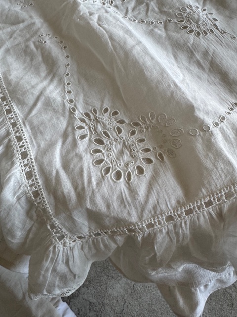 中央部分には、花のモチーフによるスカラップ刺繍の手仕事が丁寧に施されており周囲にはレースとフリルが重なるように配されています。