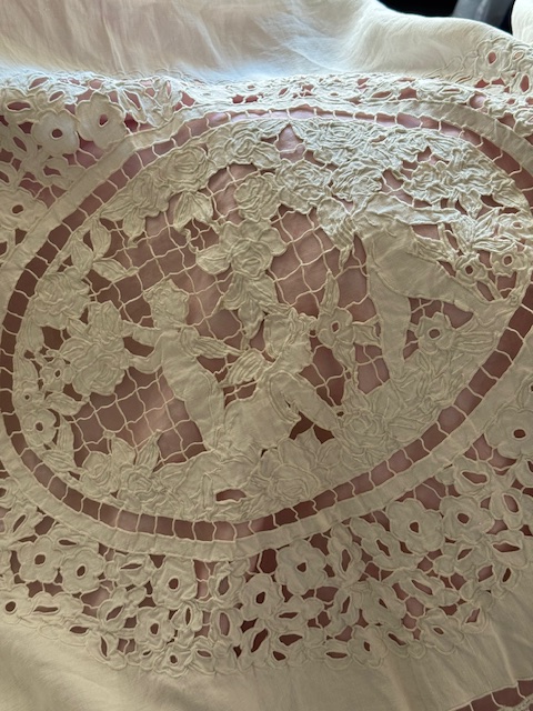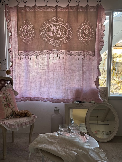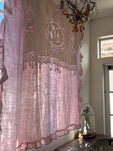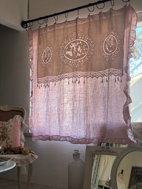 大変美しくそして非常に希少な天使のモチーフとリボン装飾が贅沢に施された1900年初頭のフランスアンティークカーテンです。