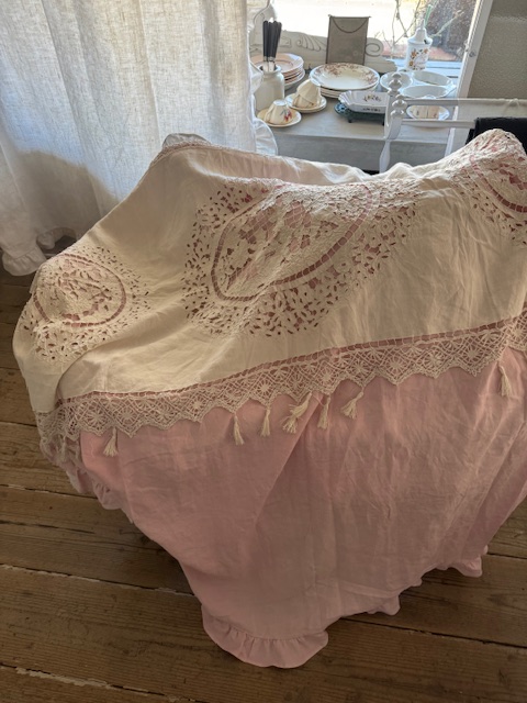 両サイドの裾にはピンクリネンのフリル装飾が施されその上に重ねられたのはホワイトリネンによる手仕事のレース装飾。