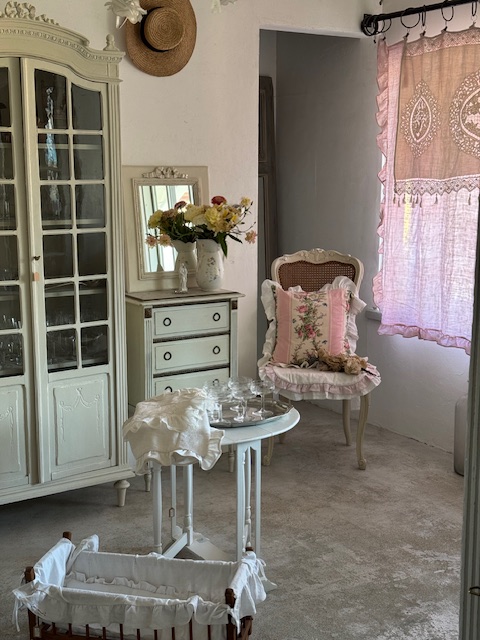 光の入る窓辺では、レースの影が美しい模様を描きお部屋の中間に配すると立体的な手仕事の陰影がより際立ちます。