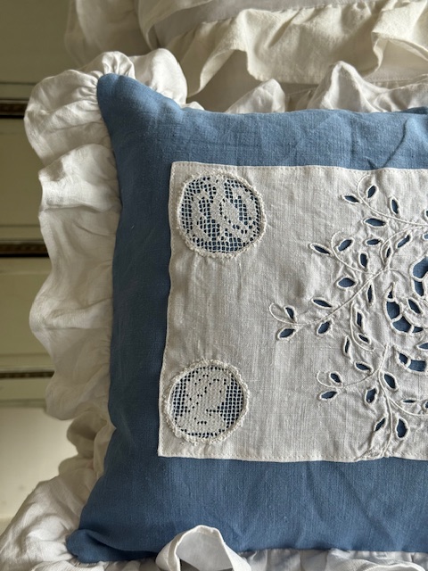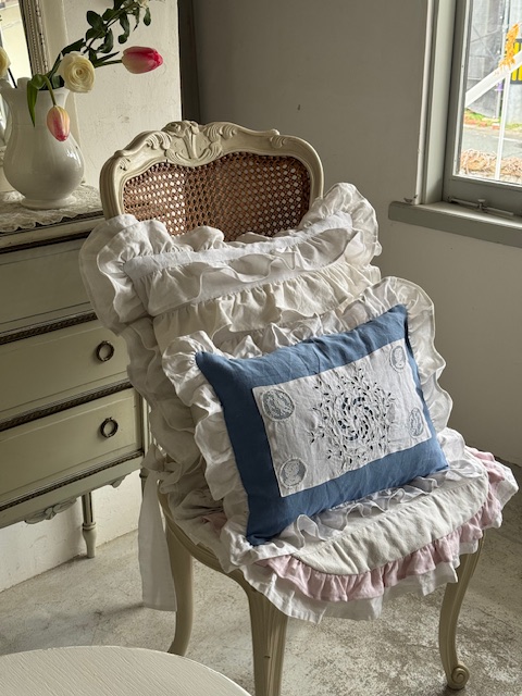 やわらかなブルーのリネン地の上には当時の職人による繊細な手刺繍が施されモチーフが立体的に浮かび上がる大変上品で可愛らしい表情のお品です。