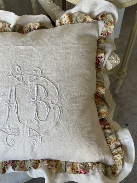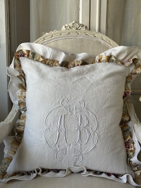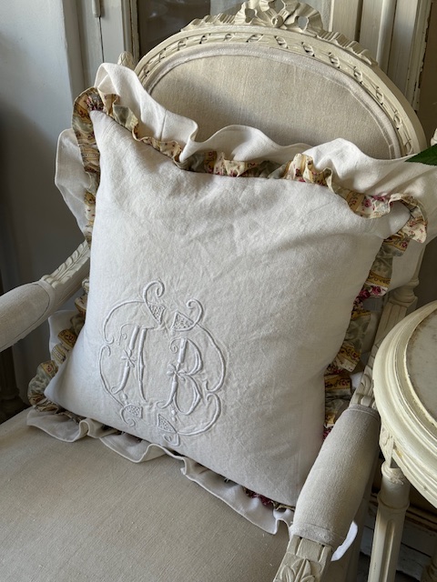 厚手でしっかりと織られたエクリュカラーの上質なリネン生地に当時の職人による立体的な手刺繍モノグラムが中央に丁寧に施されています。