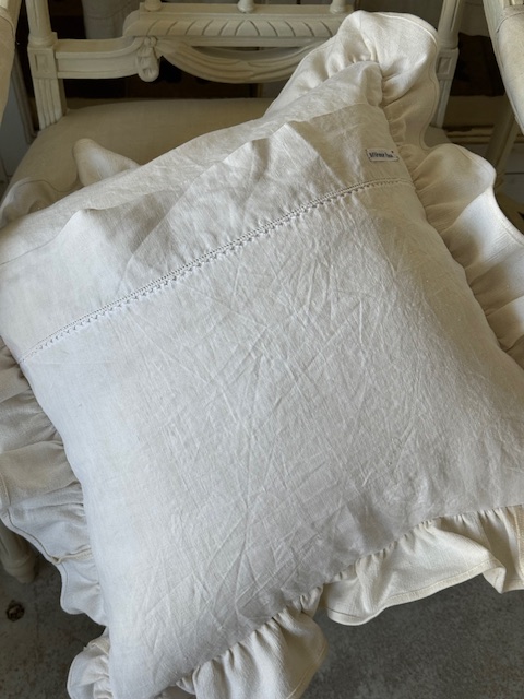 手刺繍エクリュリネン 二重フリルクッションカバー
