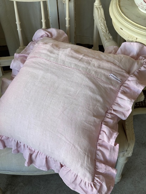 やわらかなローズカラーのリネンに当時の手仕事による立体的なモノグラム刺繍が中央に丁寧に施された可憐で気品あふれるクッションカバーです。