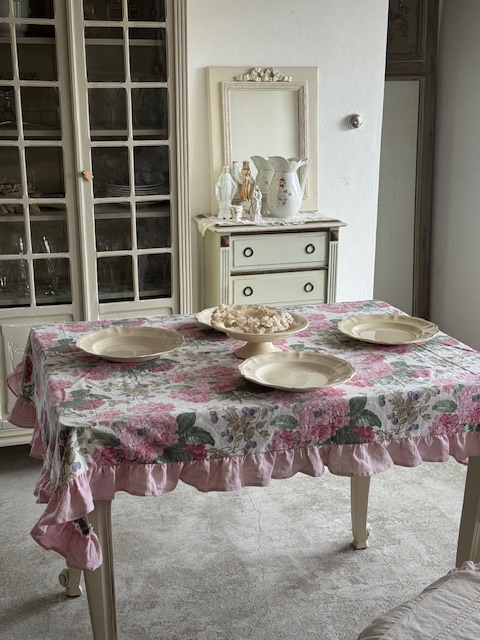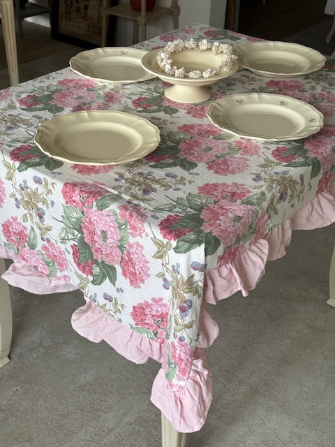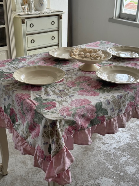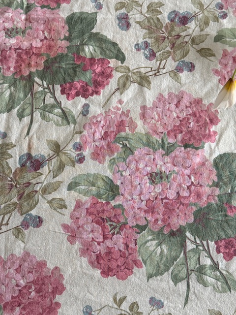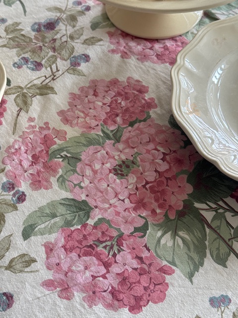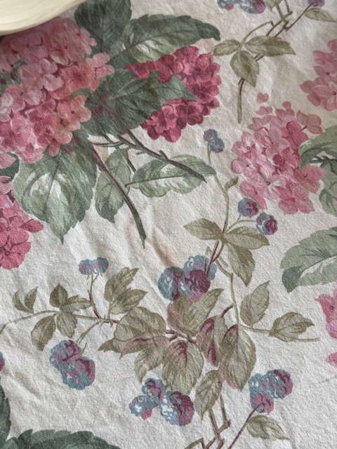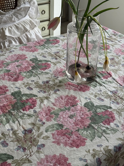 フランスアンティークの優しい世界観を感じさせてくれるピンクのアジサイとベリーが描かれたマルチクロス。