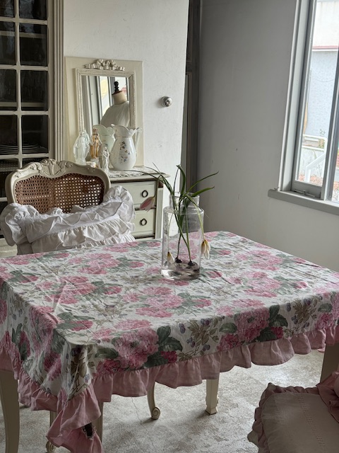 周囲には1900年初頭のピンクリネンを使用したフリル付き。