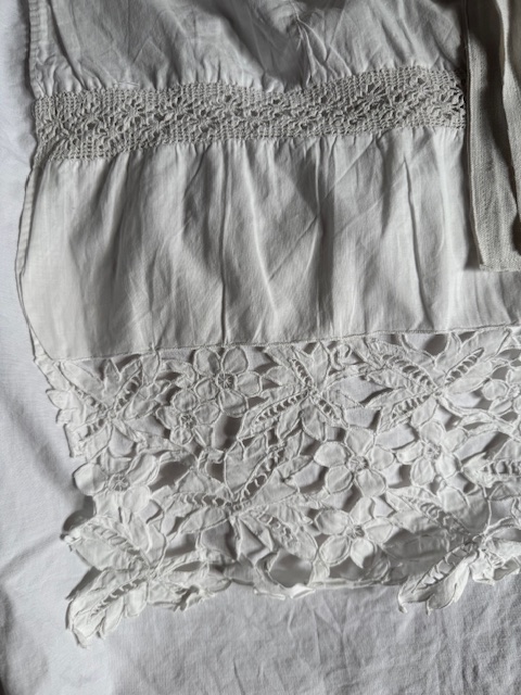 中央の装飾部分には生地に下絵を施して丁寧にカットしながら刺繍をしていく、当時ならではの手仕事によるカットワーク刺繍が全面に施されています。