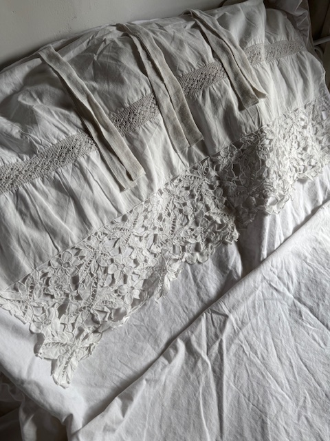 両サイドと裾には1900年初頭の柔らかなリネンで仕立てられたフリルがあしらわれており優しくエレガントな印象です。