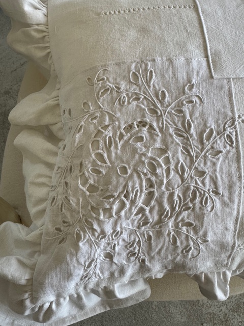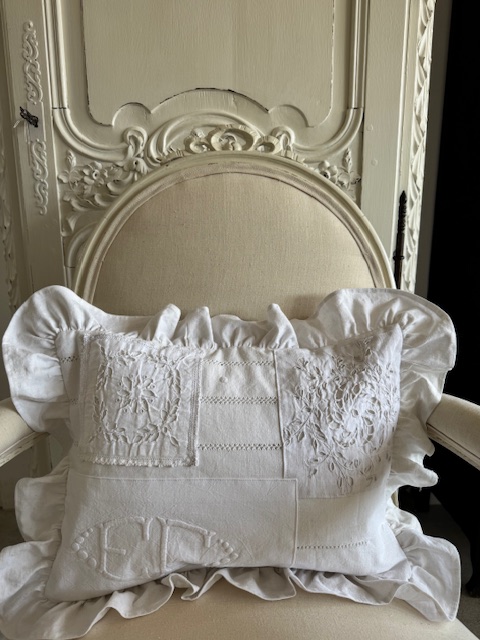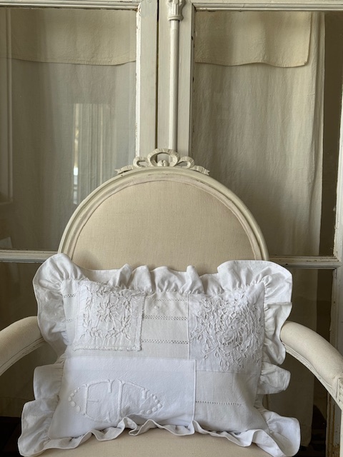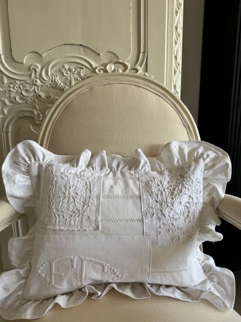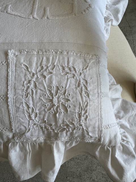 1900年初頭のフランスアンティークリネンを贅沢に使用した手仕事の美しさが詰まったフリル付きクッションです。