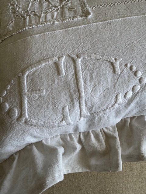 表面には当時のリネンを組み合わせたパッチワークが施され、立体的なモノグラム刺繍やカットワーク、繊細な刺繍など、さまざまなアンティークの手仕事が美しく組み合わされています。