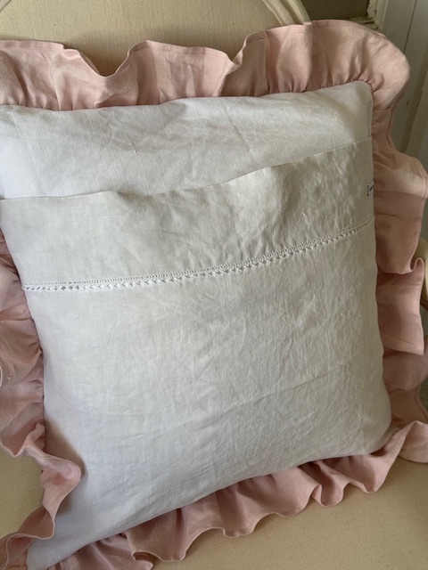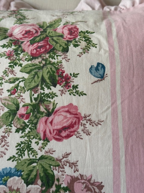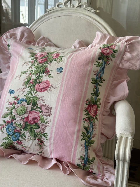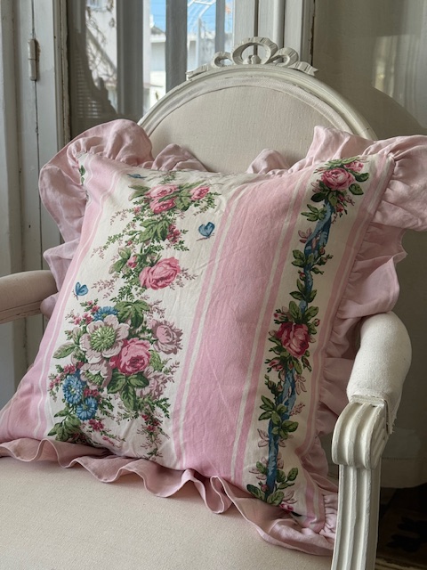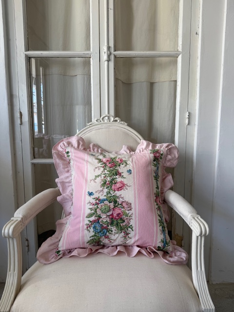 1900年初頭のフランスアンティークファブリックを贅沢に使用したフリル付きのクッションカバーです。