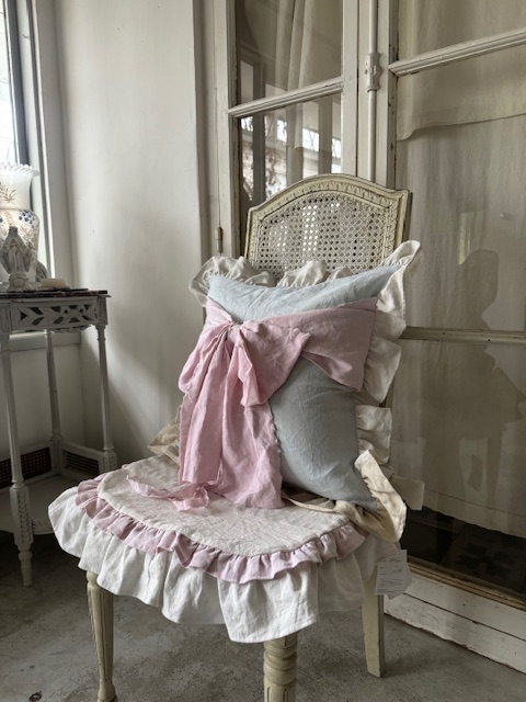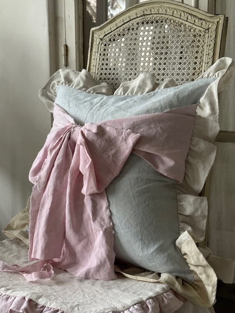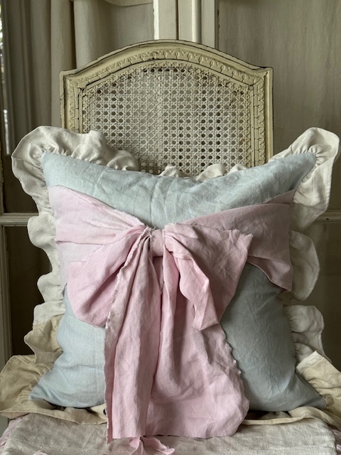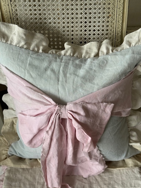 淡く儚いブルーのリネンをベースに中央には淡いピンクの大きなリボン。