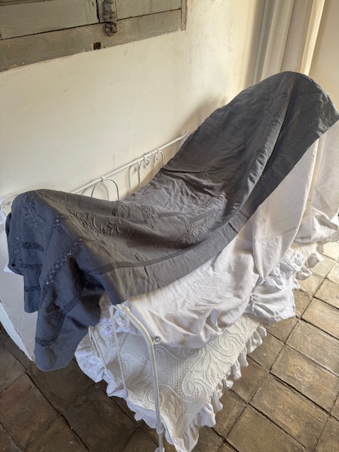 上部には落ち着いたグレーカラーの装飾リネンが重ねられており全面に施された手仕事の立体的なフラワーモチーフや糸を抜いて表現された繊細なレース模様が上品で奥行きのある美しさを添えています。(わずかな色ムラが見られる箇所がございます。)