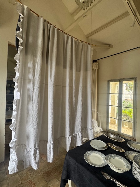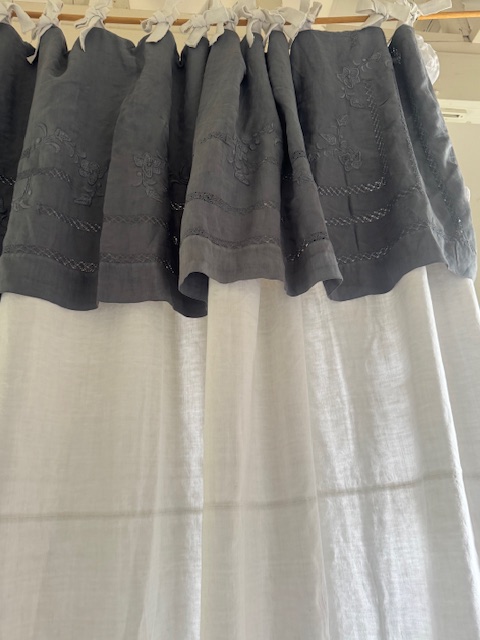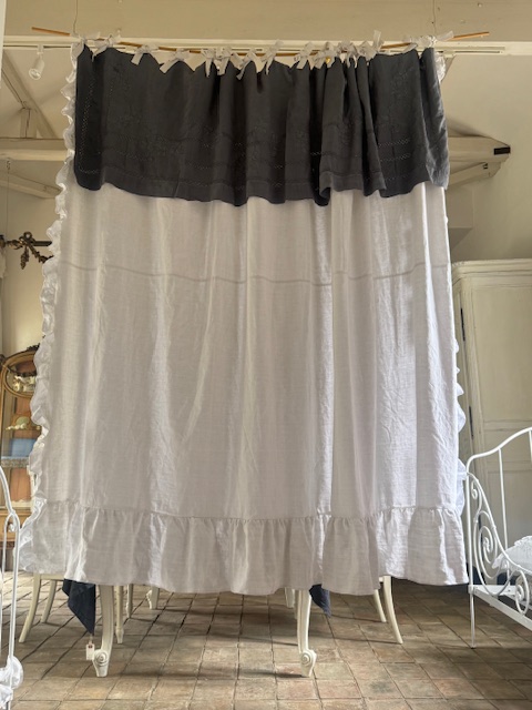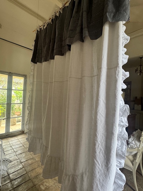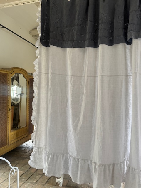 1900年初頭のフランスアンティーク、上質なリネンを贅沢に使用したフリルカーテンです。