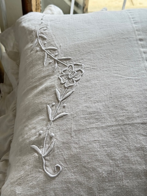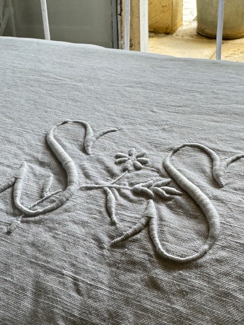 当時の手仕事による繊細なお花の刺繍やイニシャル装飾が施され静かで上品な存在感を放ちます。