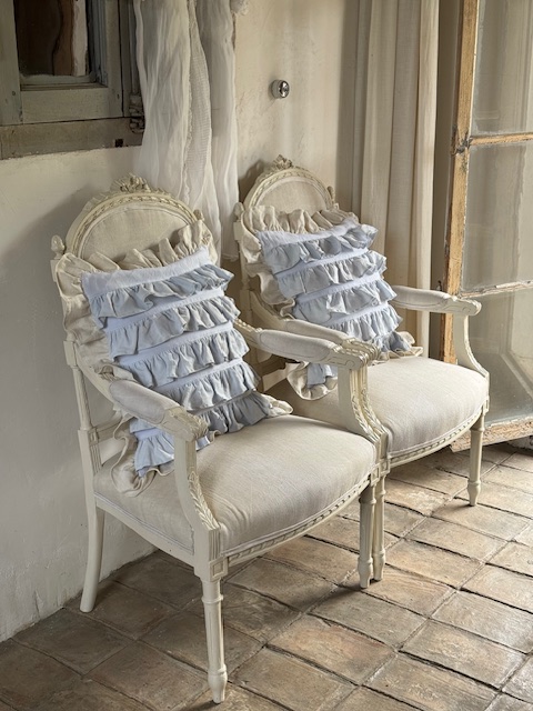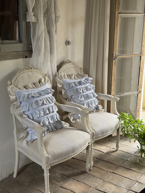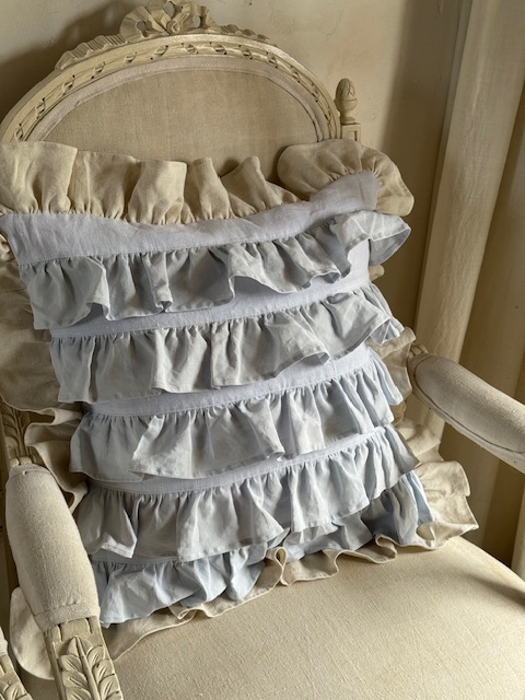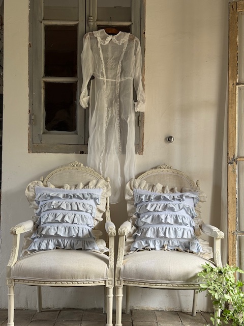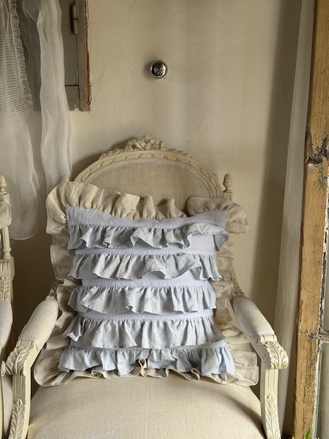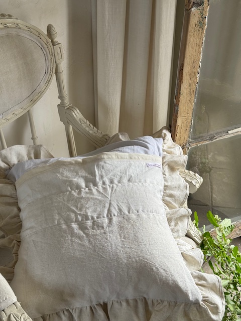 1900年初頭のフランスアンティークリネンを使用して仕立てられたフリルたっぷりのクッションカバーです。