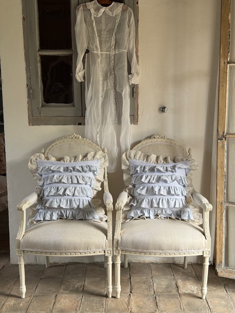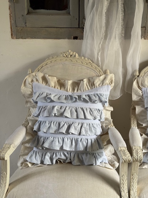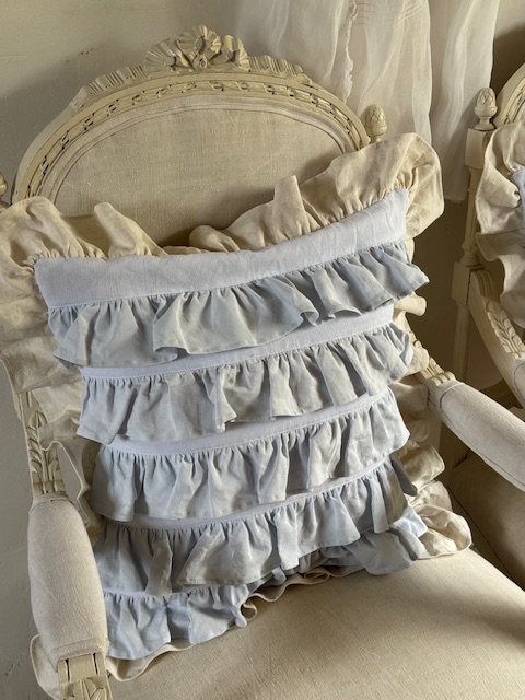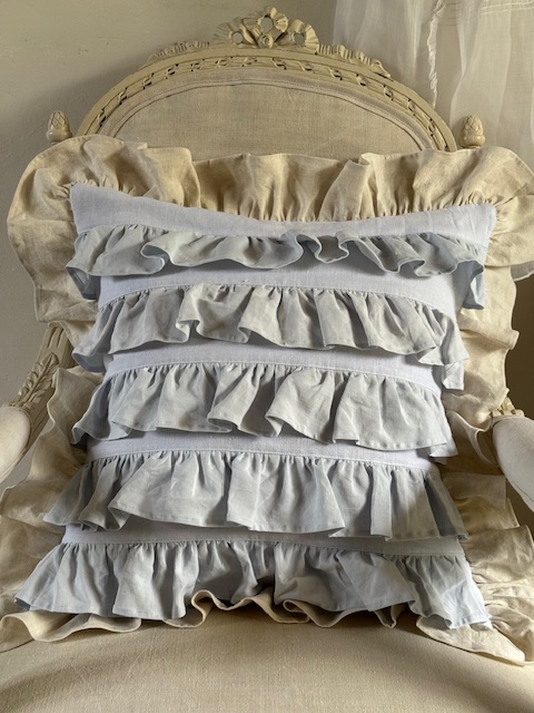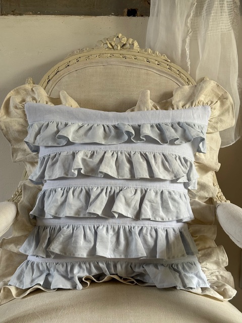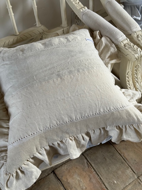 1900年初頭のフランスアンティークリネンを使用して仕立てられたフリルたっぷりのクッションカバーです。
