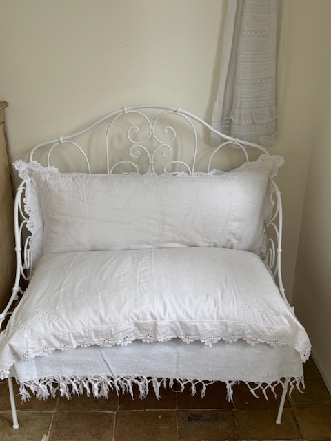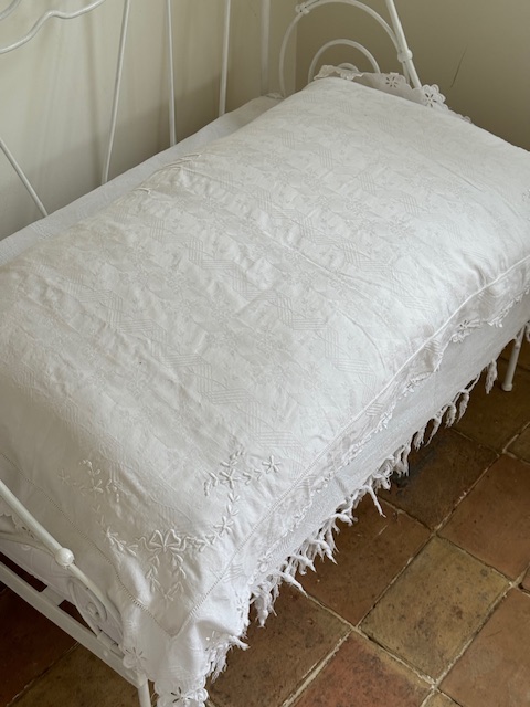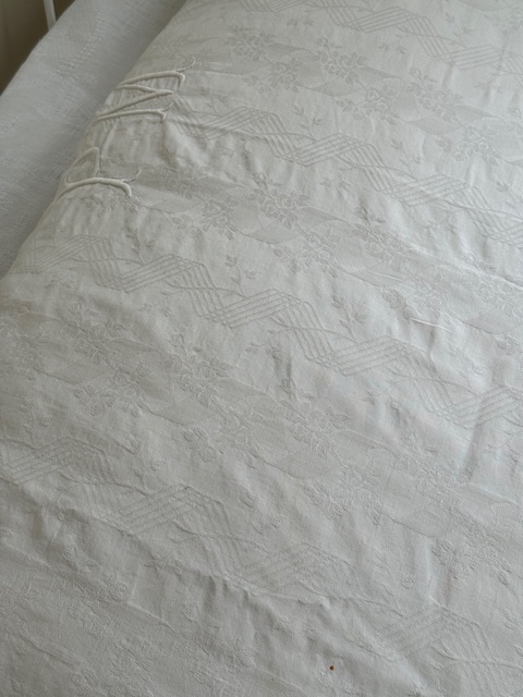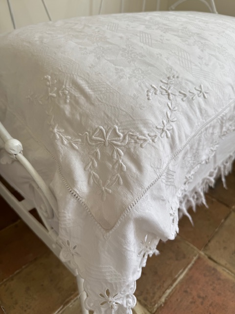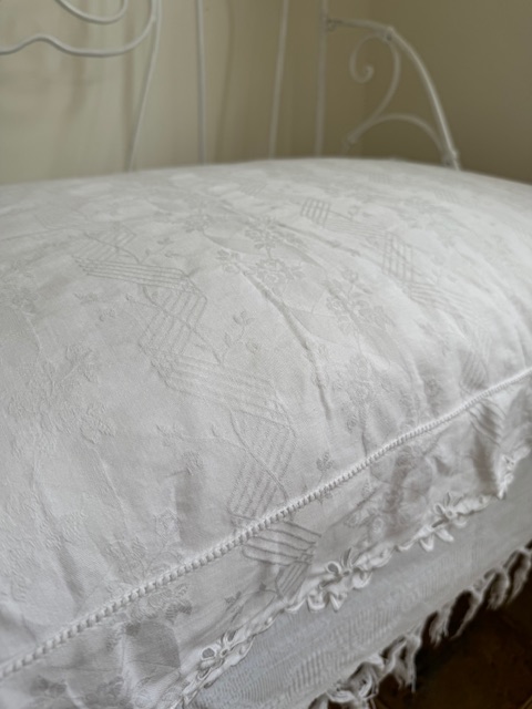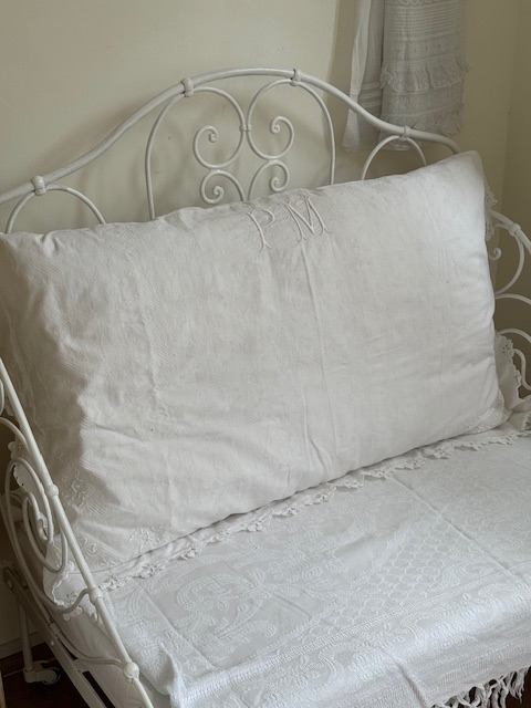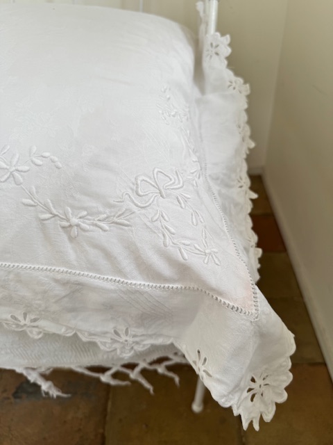 1900年代初頭のフランス製、繊細な透かし模様と手刺繍が施された大きなクッションです。