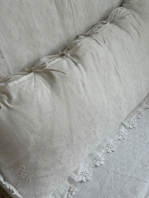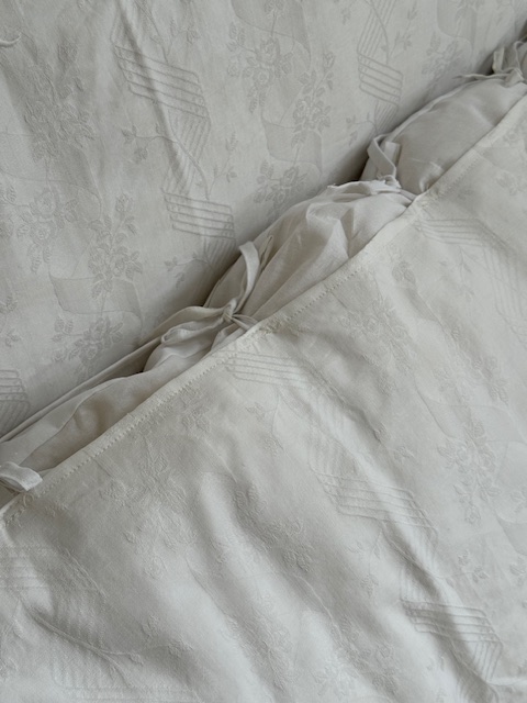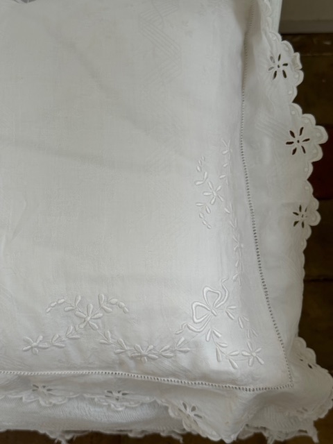 縁にはスカラップレースの波打つ花リムがぐるりと囲むように縫い込まれています。光を受けるとレースや刺繍の陰影が浮かび上がり、柔らかく上品な存在感を放ちます。