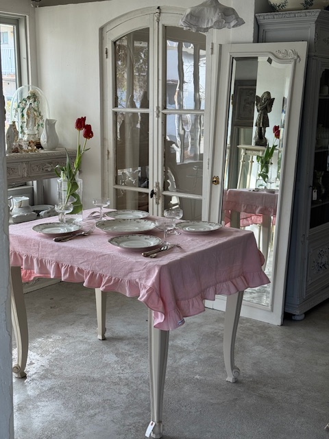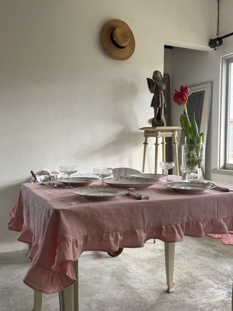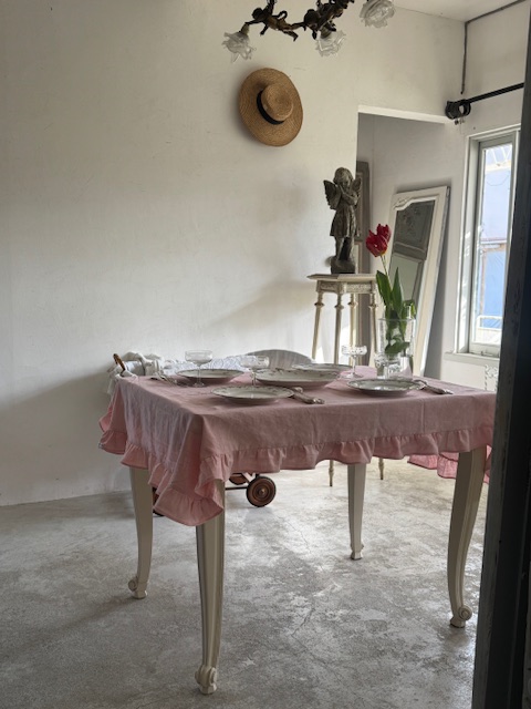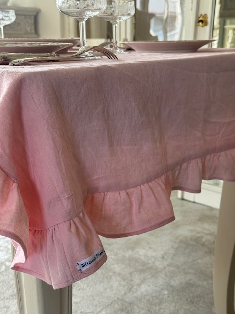 1900年初頭のフランスアンティーク、優しいピンクローズ色のフリル付きリネンテーブルクロスです。