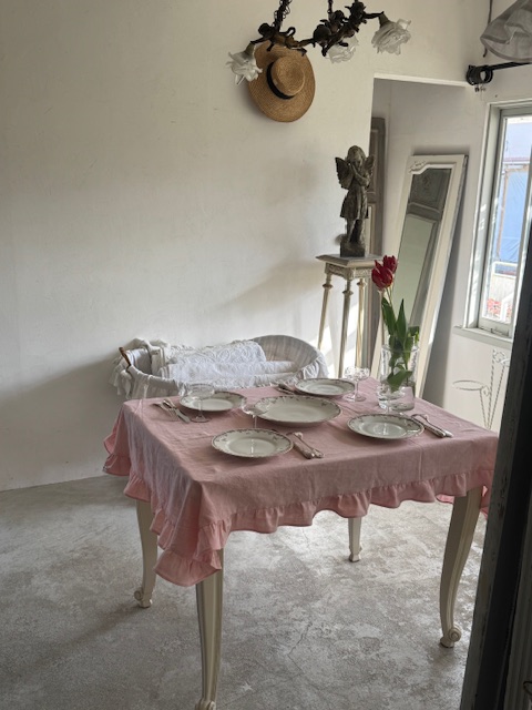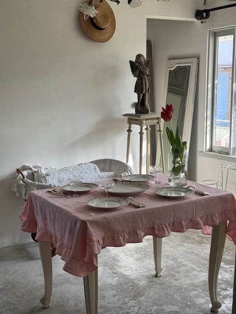柔らかな午後の日差しを受けて、空間をピュアで穏やかな印象にしてくれる心がふわりと和むようなアンティーククロスです。
