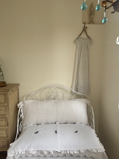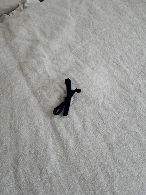 表面には、パリのデッドストックの細いベルベットのブラックリボンがアクセントとして添えられ、アンティークならではの可憐な佇まいが感じられます。