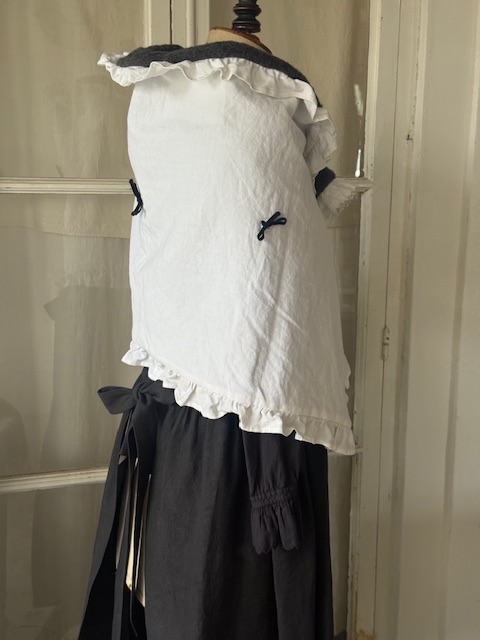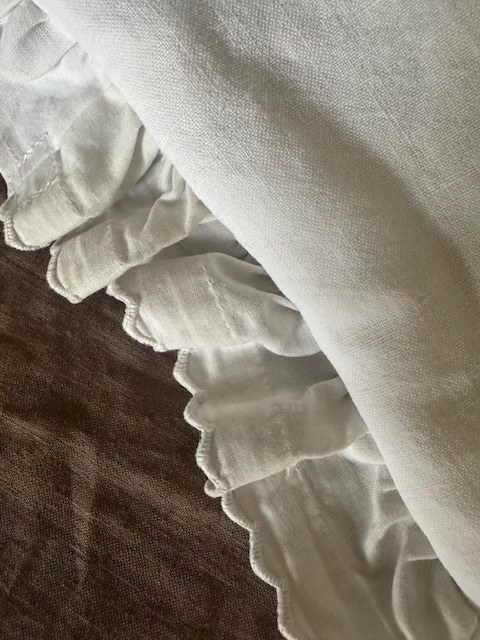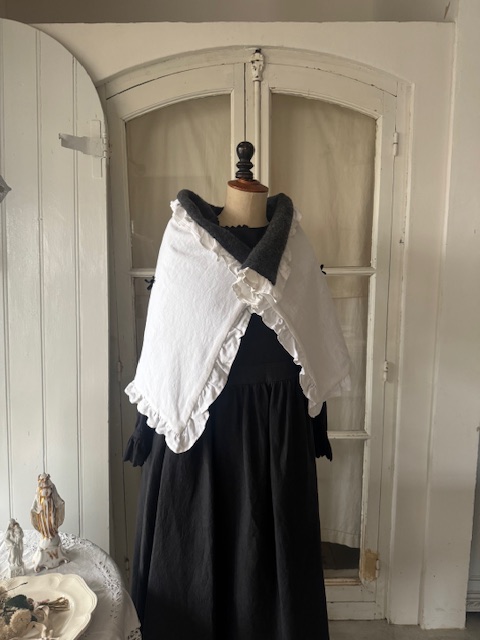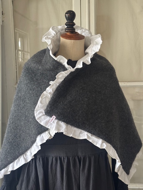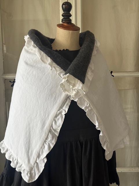 周囲にはふんわりとしたフリルが施され、手仕事による繊細な縫いの跡も見られる、大変味わい深いお品です。