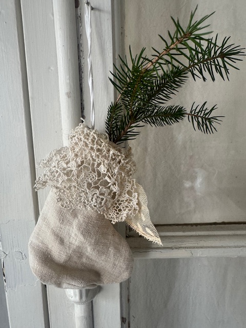 柔らかなリネンに、繊細なアンティークレースをあしらった小さな靴下型のオーナメント。
