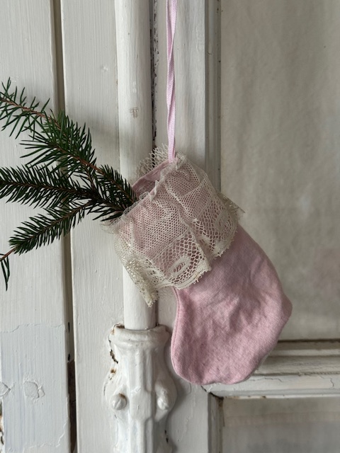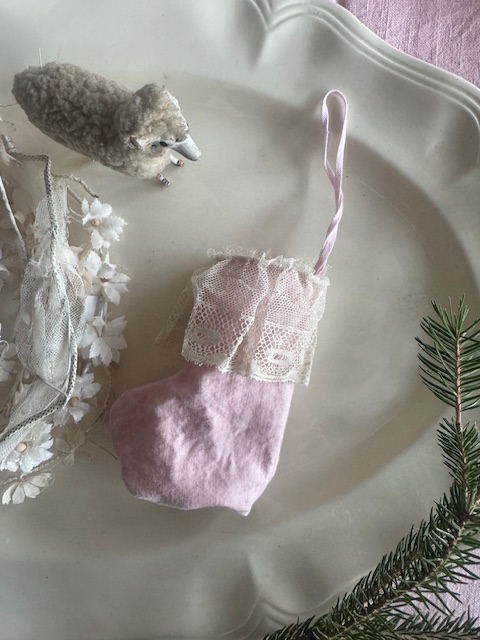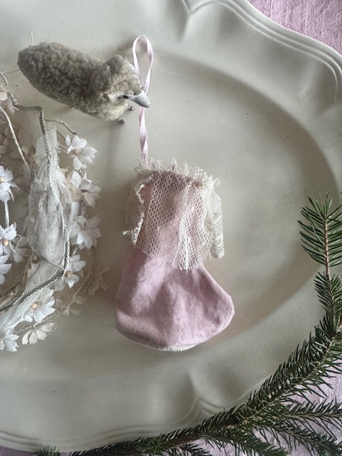 柔らかなリネンに、繊細なアンティークレースをあしらった小さな靴下型のオーナメント。
