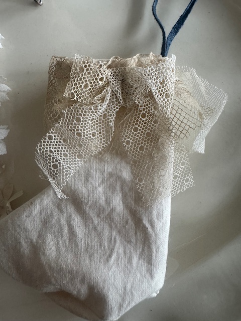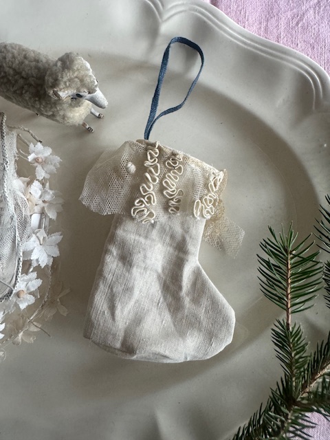 柔らかなリネンに、繊細なアンティークレースをあしらった小さな靴下型のオーナメント。